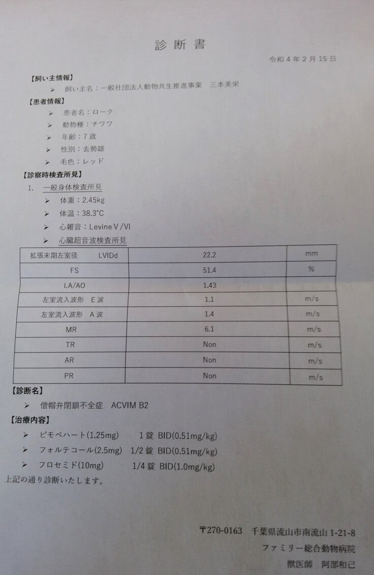 私たちの願いもむなしく心音の異常が見つかり、その後の循環器専門医の詳しい検査により僧帽弁閉鎖不全症、グレードC、余命半年」と診断されてしまいました。