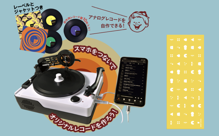 スマホなどの音源を手軽にレコード盤に残せるトイ・レコードメーカー組み立てキット。2020年の発売当初、その人気から一時品切れ状態になっていた人気ふろく。スマホの音源で、簡単にオリジナルレコードを作成できます。スピーカー内蔵なので、もちろん、市販のEPレコードも聴いていただけます。