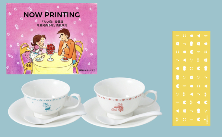 生誕60周年を迎えるみつはしちかこの名作「小さな恋のものがたり(ちい恋)」のオリジナルグッズ「ティーカップセット」と愛蔵版(今夏発売予定)のセットです。