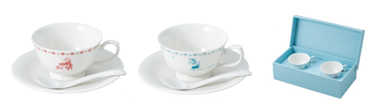 赤と青、2客セット(カップ、ソーサー、スプーン)を豪華BOX入りでお届けします。「赤」はお茶を運ぶチッチと反対側にはサリーの姿、「青」は原っぱで遊ぶチッチと縁にはイヌフグリ柄があしらわれています。