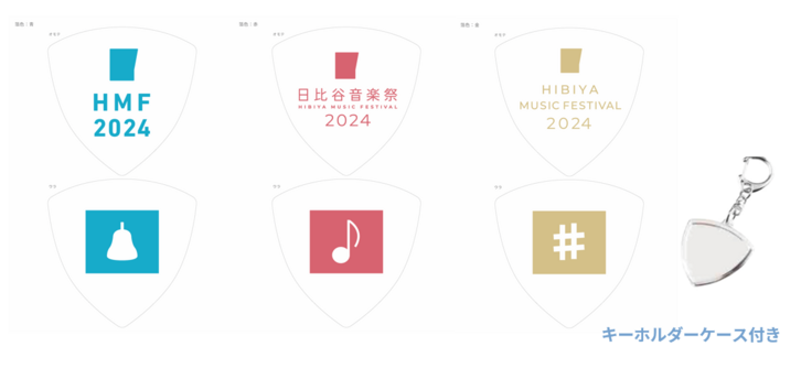日比谷音楽祭2024オリジナルデザインのピック3枚セットと、ピックをキーホルダーとして楽しめるキーホルダーケースのセットです。