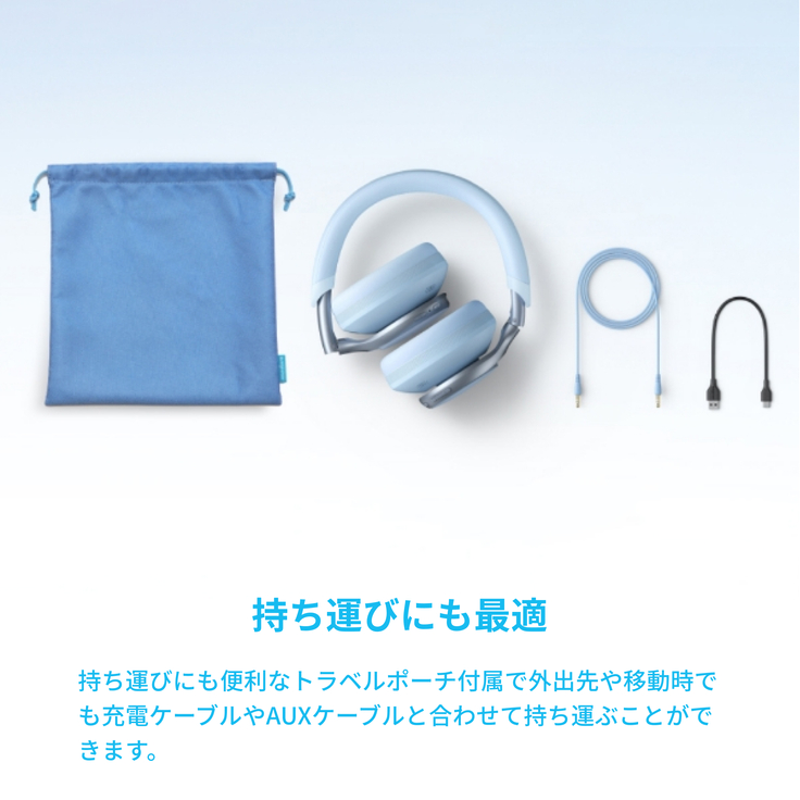 快適な装着感と、周囲の騒音レベルに対して自動で起動するノイズキャンセリング、最大55時間(通常時)使用可能なので、移動中も安心。さらに、持ち運びに便利なトラベルポーチ付き。