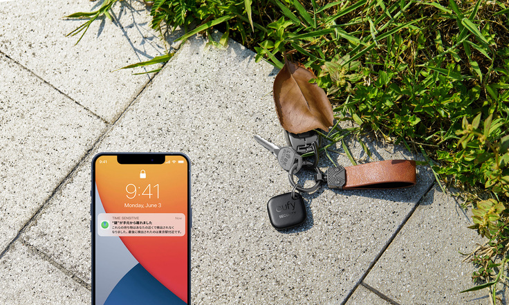 穴が開いているので、そのままいつも使っているチェーンなどに取り付けられます。そして、「なくしものが、無くなる」だけでなく、未然に防止する機能として、音を鳴らして置き場所を特定したり、置き忘れを防止する通知機能を備えています。Apple端末でも、Android端末でも対応できるアプリが使用可能。