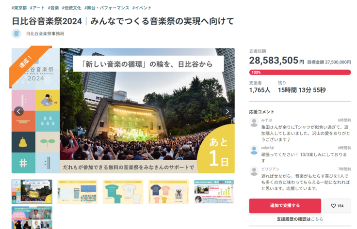 ゆくゆくは、1億円を超えるご支援をクラウドファンディングで集めて、安定的に継続開催を続けていきたい・・・そんな思いを抱きながら、残り15時間、ひとりでも多くの方に日比谷音楽祭の思いが届くように発信を続けていきます!