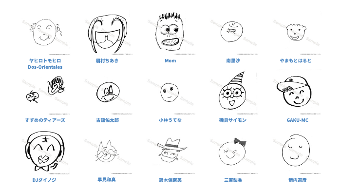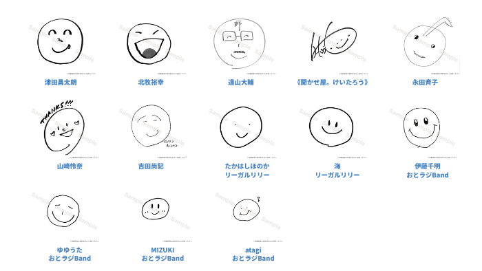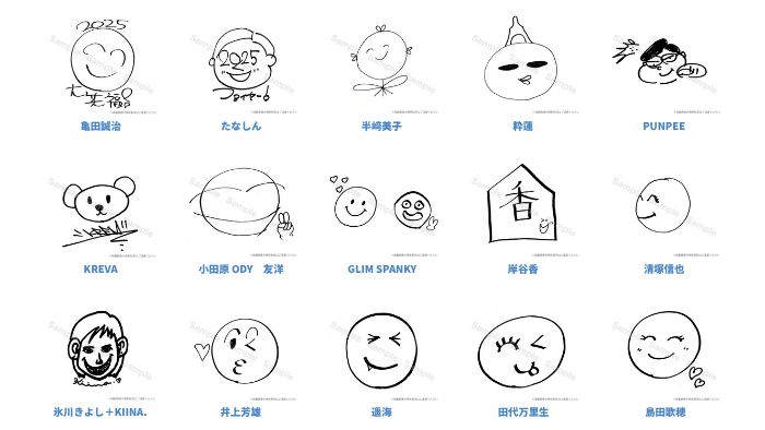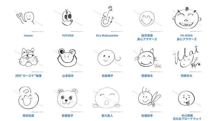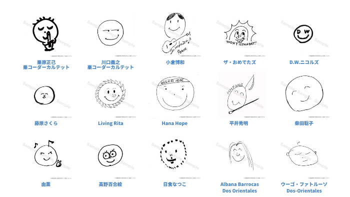 リターンのひとつ「笑福クリアファイル2025」のデザインにご協力いただくアーティストの皆さまから、個性あふれる素敵な笑福マーク(ニコちゃん)が届きはじめました!