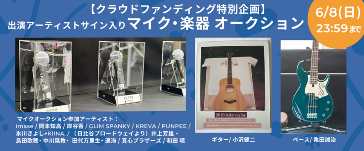 また、【クラウドファンディング特別企画】の「出演アーティストサイン入りマイク・楽器オークション」につきましては、