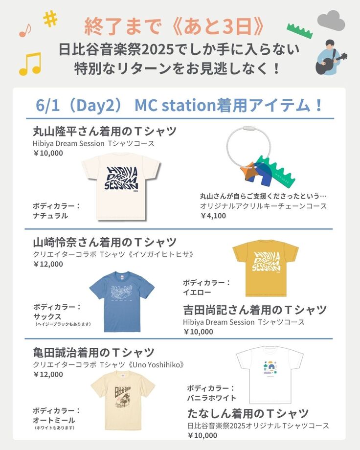 さて、今日の配信では、MC stationのメンバーが、クラウドファンディングの日比谷音楽祭2025オリジナルグッズを着用してくださっていたので、ご紹介いたします!