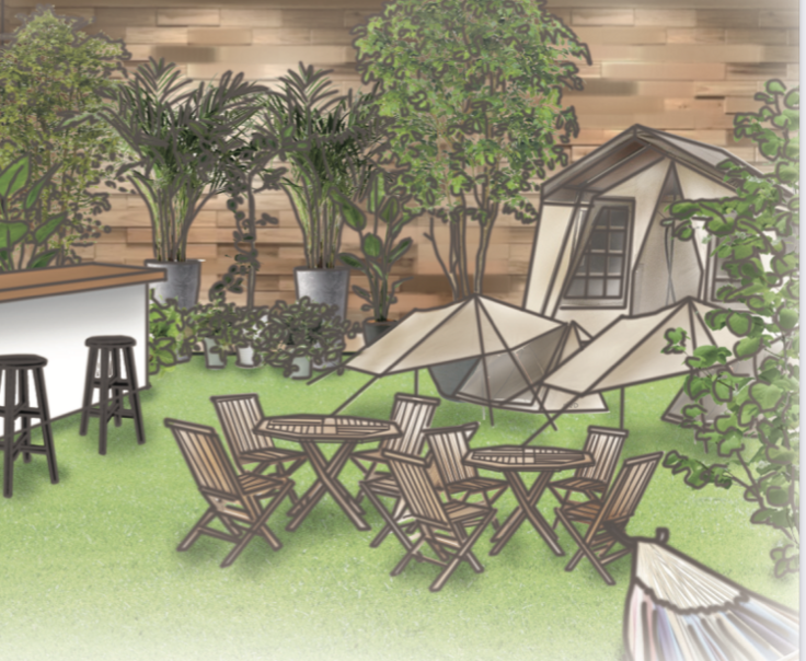 オープン予定の店舗は、緑があふれ、キャンプ気分を味わるイメージです。