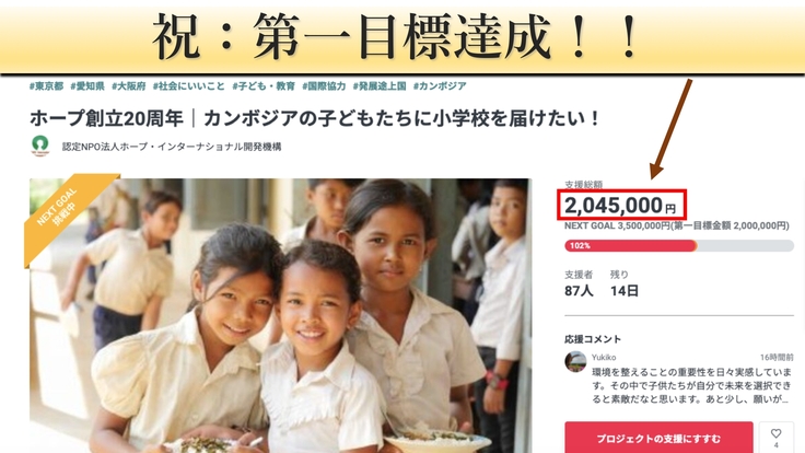 ネクストゴールを350万円に設定し、カンボジアの教育環境を地域単位で改善していけるよう、ご支援を募っていきたいと考えております。