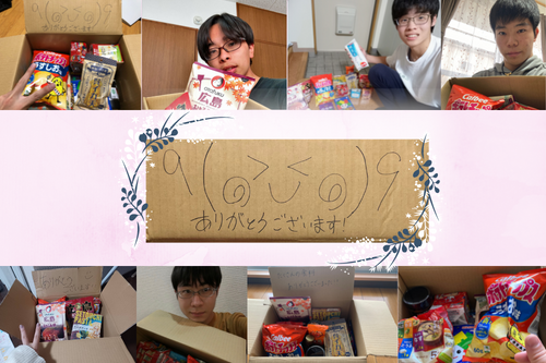受け取った学生からは、感謝と喜びの声が届いていますので、是非ご覧ください。また、一部の学生からは詰合せが届いた際の写真も送られてきました。