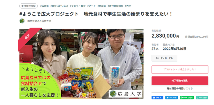 2023年5月22日~6月23日の間で挑戦しておりましたクラウドファンディング『#ようこそ広大プロジェクト2 地元の食で新生活を始める学生に笑顔を』が、当初の目標を達成し、終了いたしました。