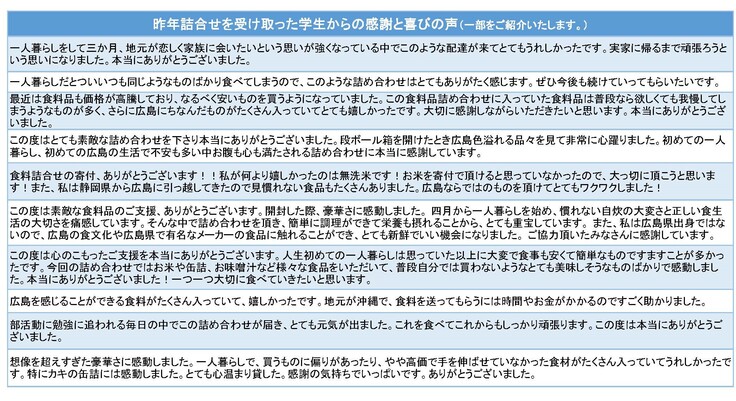 この春に一人暮らしを始められた学生の皆さんには、後輩を応援する先輩の想いと、広島の「おいしい」を通じてより豊かな学生生活を送ってもらい、将来、社会での活躍を願っております。