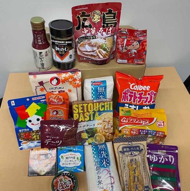 詰合わせには、広島県産米(無洗米)、ふりかけ、味噌汁、パスタソース、缶詰など、学生が手軽に自宅で食べられるもののほか、お好み焼きセットなど料理を楽しんでもらえる内容を含んでいます。