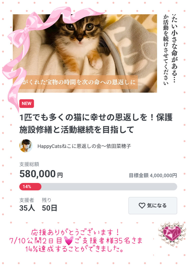 2025年7月9日(水)に公開したHappyCats~ねこに恩返しの会の「1匹でも多くの猫に幸せの恩返しを!保護施設修繕と活動継続を目指して」プロジェクト。