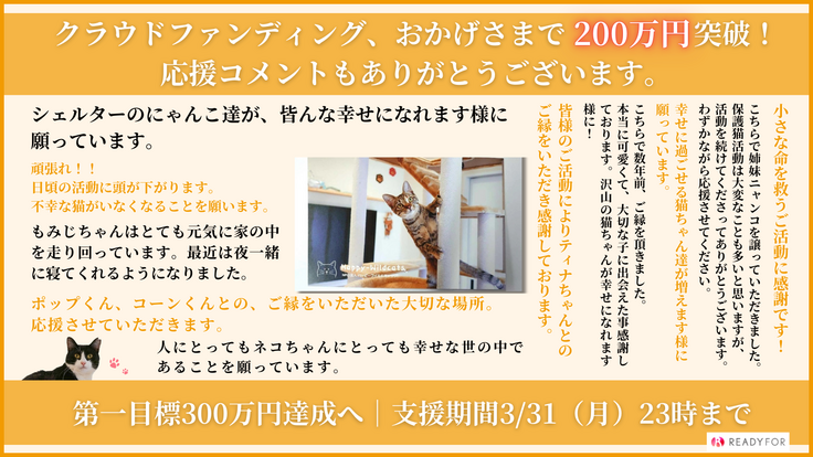 200万円突破しました!第一目標金額300万円突破に向けて引き続き応援よろしくお願いします。
