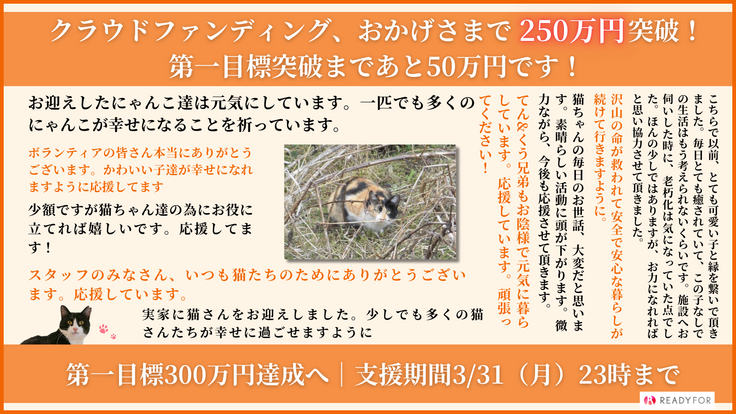地道な努力を続けることが一つの尊い命を守り、猫と人の幸せにつながると信じています。引き続き応援をどうぞよろしくお願いいたします。