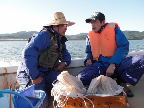 (有明海の調査船にて。左は熊本県立大学の堤先生)