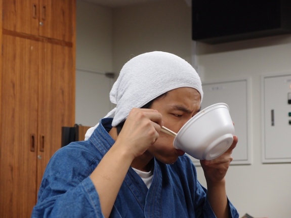 (真剣に食べる神田くん。この日は昼から夜遅くまでハードな稽古でした!)
