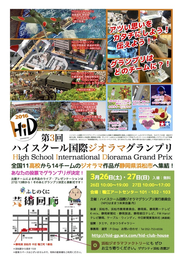 いよいよ開催までのカウントダウンがはじまた第3回ハイスクール国際ジオラマグランプリ〜HiD2016の告知チラシを公式ブログやSNSから配信しています。