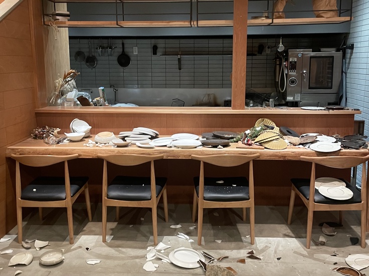 能登地方を中心に甚大な被害を受け、当店も建物壁面の亀裂や駐車場の隆起、多くのワインや作家さんに特注で作っていただいた器など60点以上が割れるなどの被害がありました。