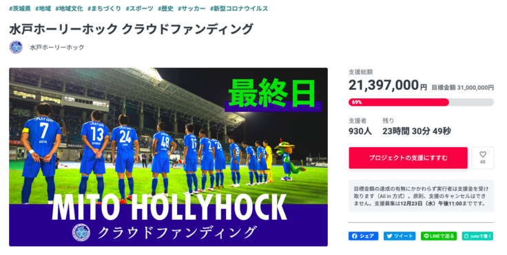 11月1日より始まりました水戸ホーリーホック初のクラウドファンディングへの挑戦も、本日23時までの最終日を迎えました。