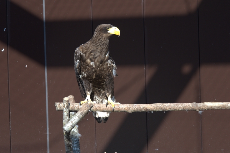 事故の後遺症で野生に帰ることができないワシたち。この若いオオワシも、威風堂々としているが左翼の先が無い。自然界に比べると遙かに狭い空間で、傷害ある彼らのQOLの向上を目指した環境エンリッチメントをいかに進められるか。“対話”をしながら更にチャレンジしてみたい。
