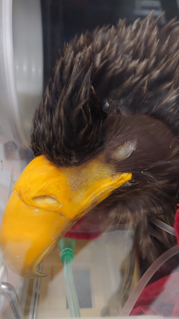 列車事故のオオワシ。循環器不全と呼吸困難に陥り、点滴を受けながら何とか持ちこたえている状態。列車事故の死亡率が高いのは人間と同じ。だからこそ、予防が治療にも増して重要だ。線路脇のシカの轢死体が餌として誘引している以上、速やかにこれを撤去する以外に根本策はない。