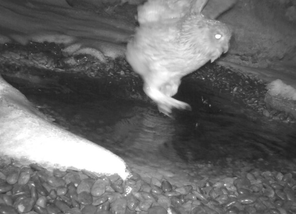 交通事故で翼を折り、頭を強く打って視力障害が確認されていたシマフクロウ。治療によって回復し、現在リハビリ中だ。浅くした池の中ではあるものの、連日魚捕りに励んでいる。一羽の命が種の存続に直結する希少種では、傷病個体の救命も重要な取り組みになっている。