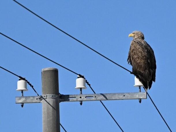 配電柱にとまるオジロワシ。どうか漏電していませんように!人間が作り出したものを利用する野生動物たちは、事故や中毒という副作用を被ることも多い。利用されることを想定した予防対策を予め講じることで共生への道は開ける。