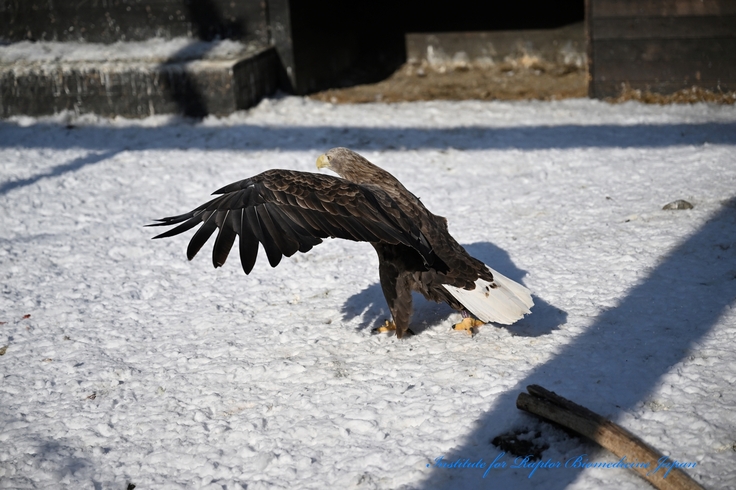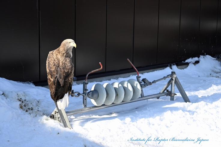 一命を取り留めたものの、後遺症で野生に帰ることができないオジロワシ。生活の質を高く保ちながら、大切に継続飼育している。彼らは教育啓発だけではなく、輸血のドナーとして治療を手伝い、感電事故や交通事故を防止するための器具を開発するために力を貸してくれている。
