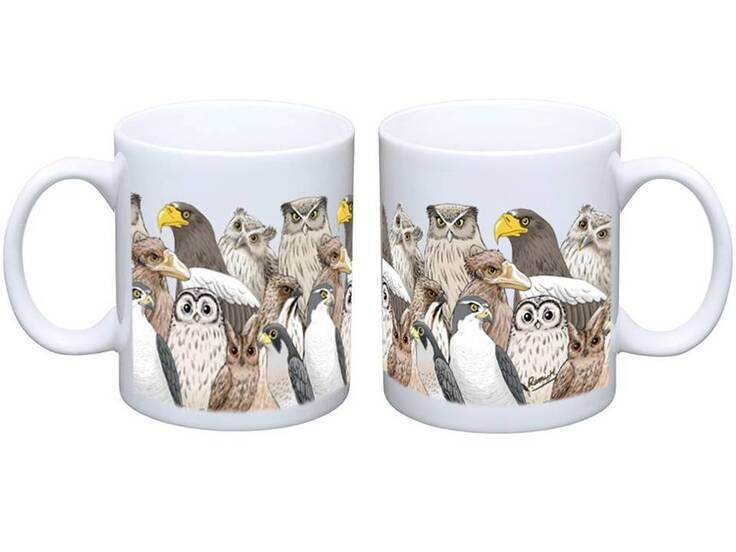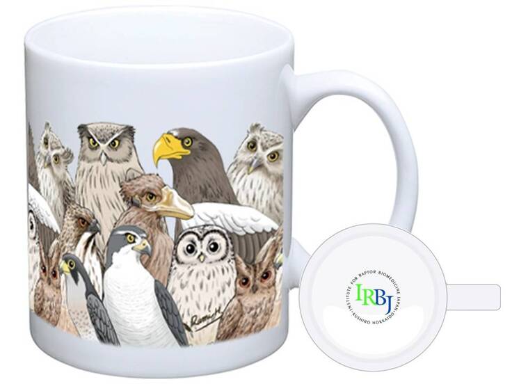 北海道の猛禽たちが、ぐるりと一面、ぎゅうぎゅうに詰まったマグカップです。よ~く見ると、猛禽類医学研究所のちび(シマフクロウの親善大使として活躍)・ベック(義嘴の開発で活躍)も一緒に並んでいます。底面に猛禽類医学研究所のロゴ入り!