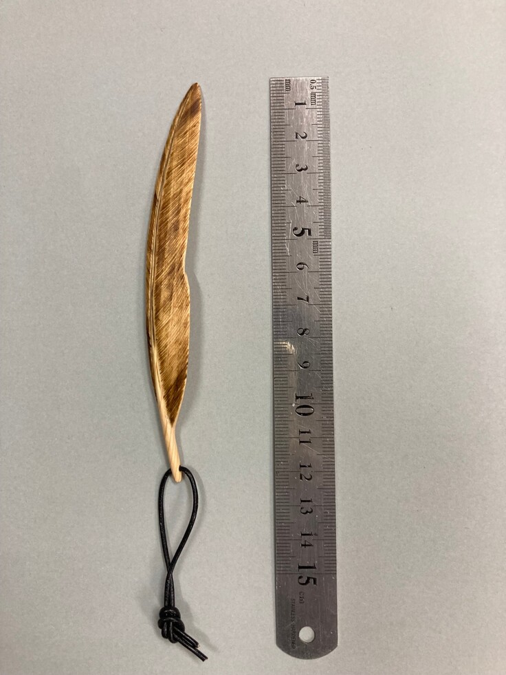 木彫りで表現されるハイタカの風切羽根。両方のエッジをナイフとして使えるように加工しているため、利き手問わずご使用いただけます。小・大サイズよりお選びいただけます。また、よりリアルなバーニング処理を施した作品もありますので比較してお選びください。