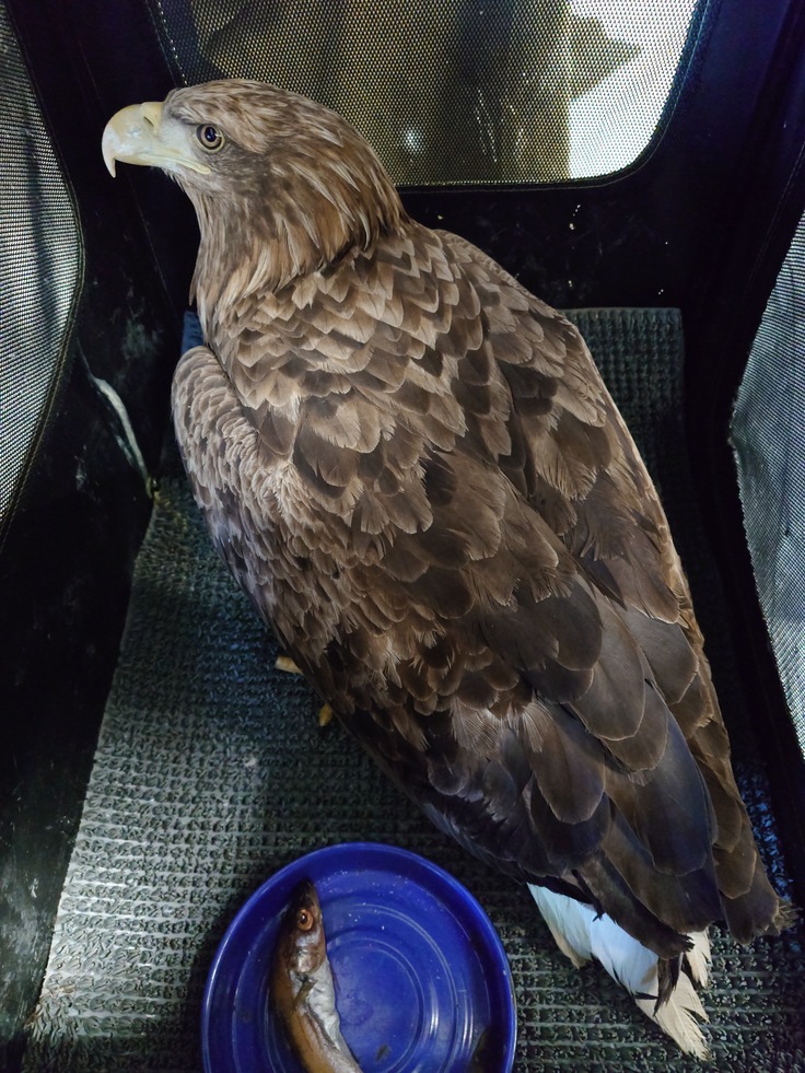 昨晩、稚内から搬入されたオジロワシ。こちらが今朝7時の姿。しっかり起立しており、目力が増したように感じました。この時はまだ置き餌を口にしていませんでしたが、昼過ぎに与えた魚は自ら食べました。しっかり療養して居るべき世界を目指そう!