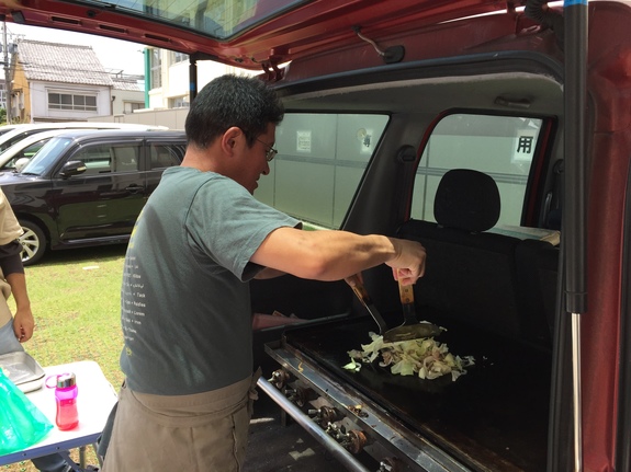 場合によっては同じ日に別の場所で同時刻に出店しなければいけないくらいになってきていまして、新たに「焼きそば職人」を育成しなければ回らないかも、、、ということで、先日、写真の男性に焼き方を指南いたしました!