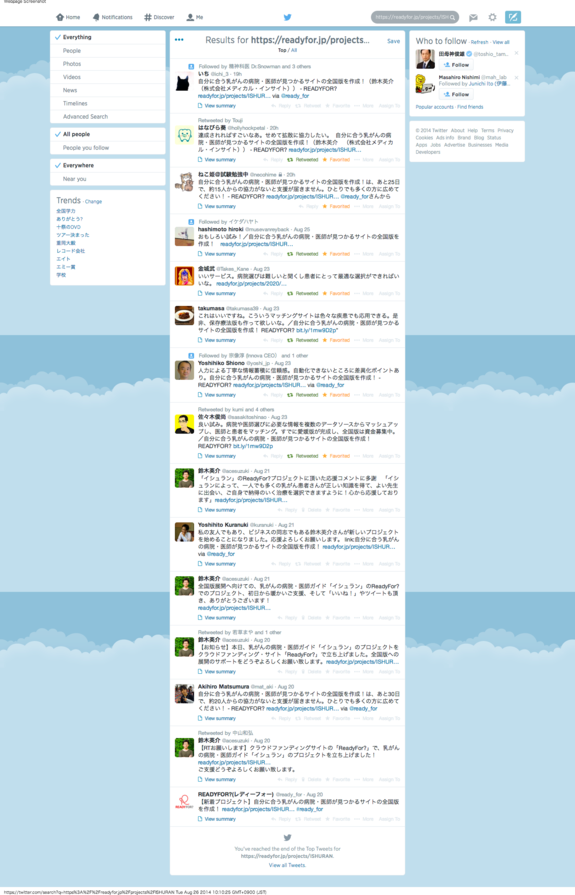 プロジェクトを開始して1週間あまりですが、おかげさまで多くの「いいね!」やTwitter上でのコメントを「イシュラン」のReadyFor?プロジェクトのページに頂いています。