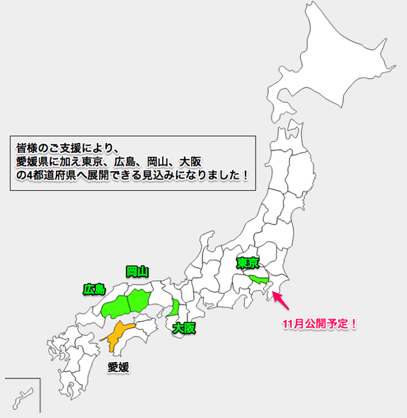 皆様のご支援により、愛媛県に加え東京、広島、岡山、大阪の4都道府県へ
