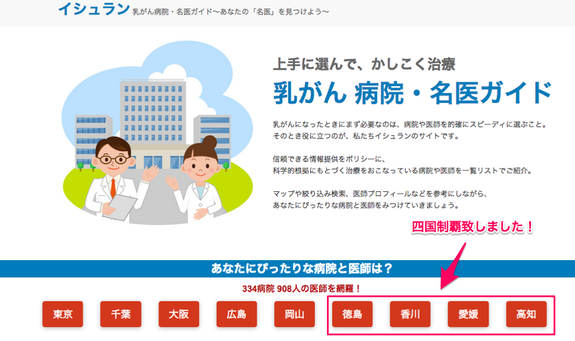 本日、乳がんの病院・医師ガイド「イシュラン」にて四国全県をリリース致しました!また、合わせて他県でのデータ更新や一部デザインリニューアルを行っております。