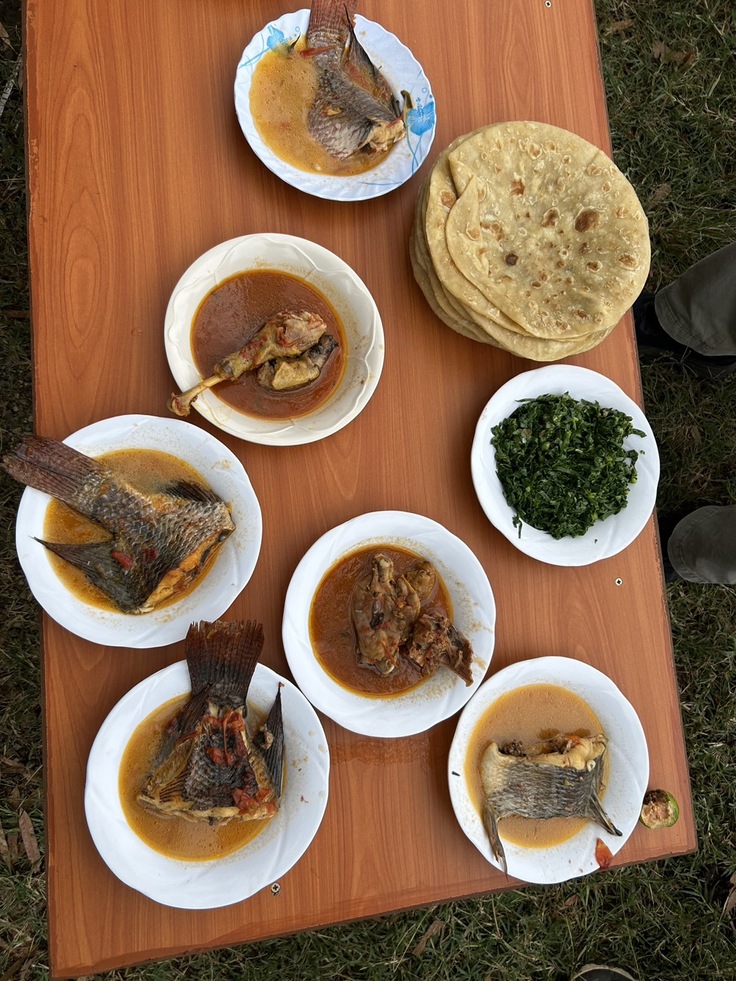 午前中に政府の方々に挨拶をしてから出発し、道中のローカルなお店(日本の道の駅のようなところです)でお昼を食べました。魚、牛肉、鶏肉をウガリやチャパティ、ケールと共に食べるケニアらしいスタイルです。ウガリを作っているところや鶏を絞めるところを見せてもらい、改めて命をいただいているという実感が湧きました。