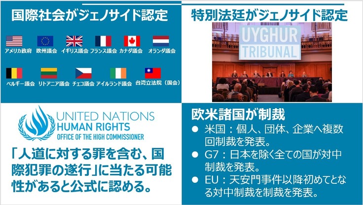 2023年5月現在、11の議会(米国、英国、フランス、カナダ、ベルギー、オランダ、チェコ、アイルランド、リトアニア、台湾、そして、欧州議会)と一つの政府(米国)が、ウイグル人に対して犯されている犯罪をジェノサイド(特定の民族などの集団を破壊する目的で行われる集団殺害、およびそれに準ずる行為)や人道に対する罪に該当すると公式に認めています。昨年、日本の衆議院と参議院の両方がウイグル問題に関する歴史的な決議を採択しています。