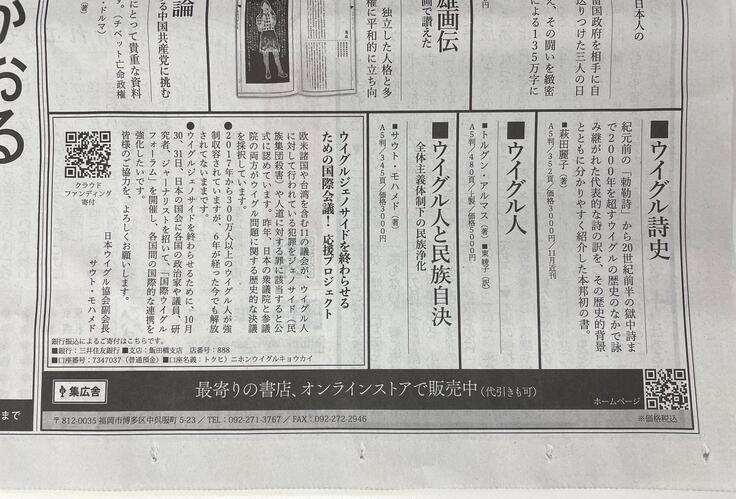 10月3日、「国際ウイグルフォーラム」応援プロジェクトは、集広舎によって、『産経新聞』広告に掲載して頂きました。