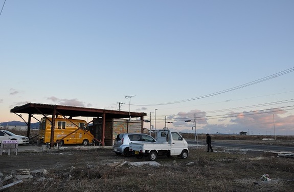 「このままでは街が消える。誰かが戻らなければこの地に人は帰って来なくなる」。そう思い、ただ一人戻って活動を始めた人が実行者の1人、尾形勝壽です。震災前はこの場所でラーメン屋をやっていた彼は震災によって家を失い、奥さんはいまだ行方不明のままです。しかし、この街の再生を目指し、借金してキッチンカーを購入。雨の日も雪の日もこの場所で石巻を盛り上げるご当地B級グルメ「石巻やきそば」を焼いています。