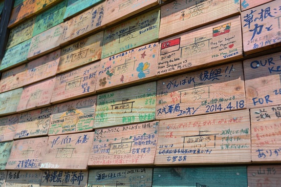 いしのまきありがとうハウスの外壁には、これまでに来てくれたたくさんの人からのメッセージが貼られています。