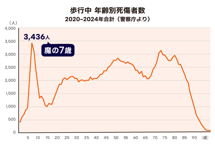 2020年から2024年の過去5年間に全国で発生した歩行中の交通事故の死傷者数を見ると、全年齢の中で7歳(小学1・2年生)が3,436人と最も多くなっています。
