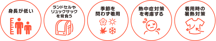 この規格は、小学生が歩行通学や課外活動時に着用することを前提としており、以下の点に配慮されています。