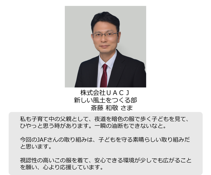 だからこそ、交通安全の推進を掲げるJAFが、クラウドファンディングを通じて社会に働きかけ、児童向け高視認性安全服の認知度と普及率の向上を目指すことに、大きな意義があると考えています。
