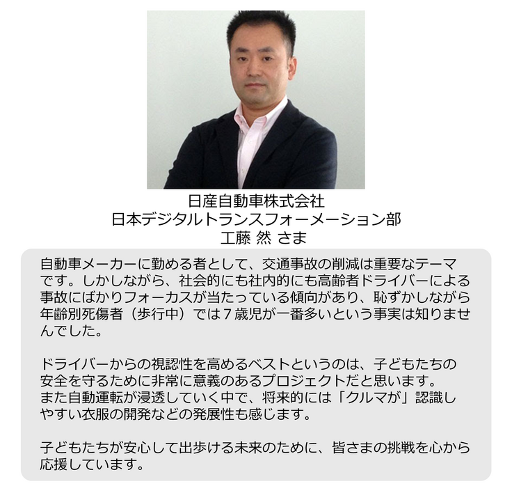 このプロジェクトは、そうした経験と想いから生まれたものであり、交通事故から子どもたちの未来を守る一助となることを心より願っております。