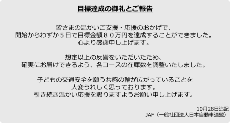 また、このクラウドファンディングを通じて、子どもの交通安全に関心のある方々の声を直接受け取りたいと考えています。