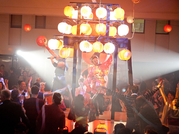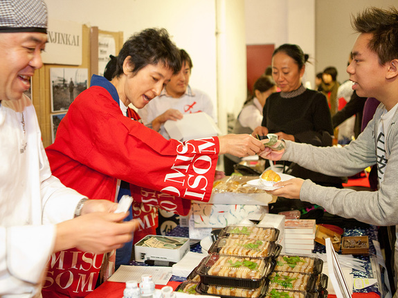 日本・海外で活躍するアーティストの作品販売ブースや、屋台風の販売ブースで賑わうロビーは、日本のお祭りの雰囲気でいっぱい。