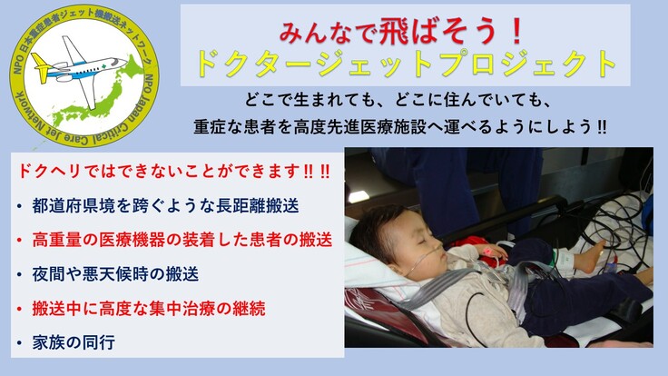 どこで生まれても、どこに住んでいても、地域では受けられない高度専門医療を必要とする重症な子どもを、ジェット機で高度専門医療施設、特にPICUに搬送するための試験運航事業を実施するための準備費用を募るためのクラウドファンディングに温かいご支援を賜り、こころより感謝申し上げます。お陰様で833人の支援者さまから、1537万1千円もの大切なご支援をいただきました。また、力強く、切実にドクタージェットの実現を願う声をいただき、導入への決意を新たにすることができました。