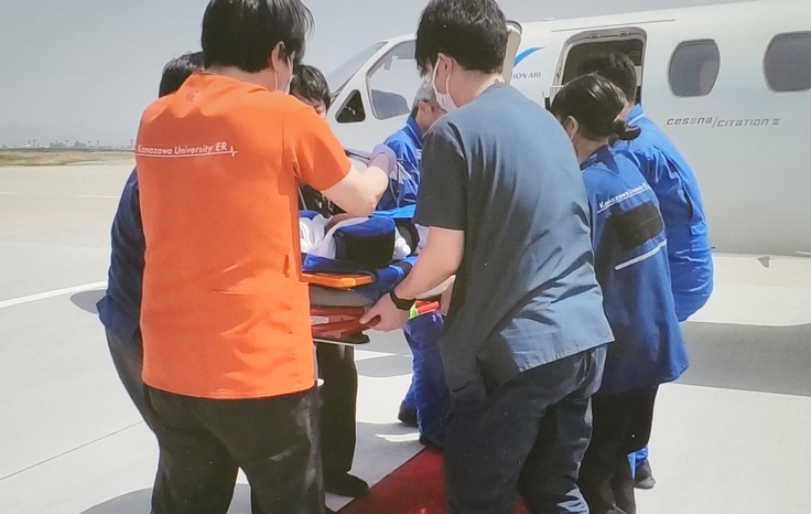 搬送チームが小松空港に到着したのを確認してから、金沢大学チームが患児を小松空港まで搬送し、機内に搬入しました